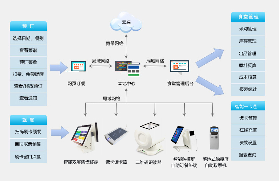 就餐者可以通过手机微信或者APP、网页进行提前订餐、退餐,方便就餐者随时随地订餐,系统显示餐品的详细信息,就餐者可以看到陈列的菜品并进行单点或套菜的预订,方便就餐者更自由的选择自己喜爱的餐品,同时在线订餐省去了食堂排队选餐时间,大幅提升就餐者用餐体验。