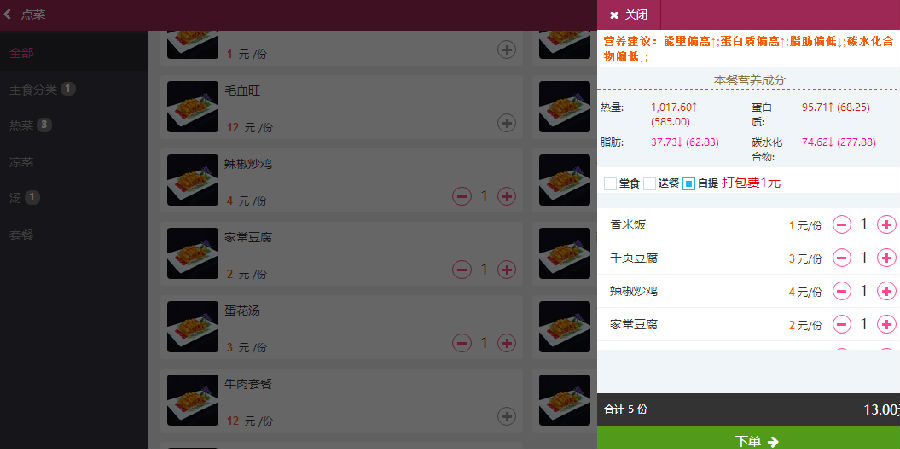 食堂在线订餐系统支持手机app、微信、网页等形式的订餐,就餐者提前进行预订爱吃的菜品。为方便不同人群的就餐需要,满客宝智慧食堂管理系统不仅支持堂食就餐模式,还支持自提或派送。