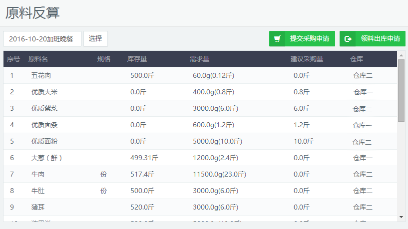 根据原料需求结合库存数据,自动生产采购申请和出库申请,为备餐做好充分准备。