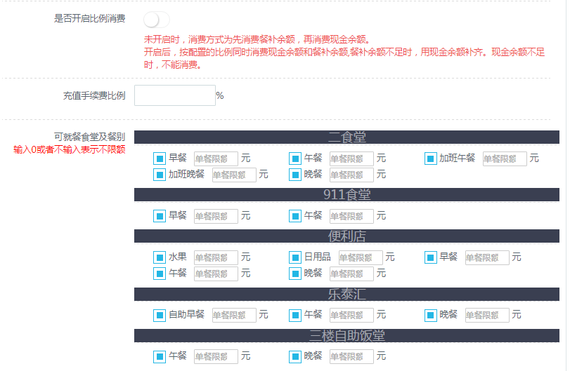 最后是设置可就餐食堂、餐别及单餐限额,根据食堂需求自由设置。