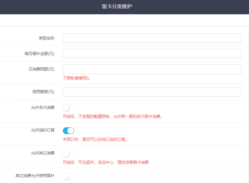 首先填写饭卡类型,然后是餐补金额,有些企业会给员工发放餐补,根据饭卡类型的不同,我们可以设置设置不同的餐补金额,每月自动发放。员工饭卡有可能出现余额不足的情况,在这里系统设置其一个透支的金额,类似信用卡的功能。用过之后我们员工可以充值或在薪水种扣除等方式补齐。