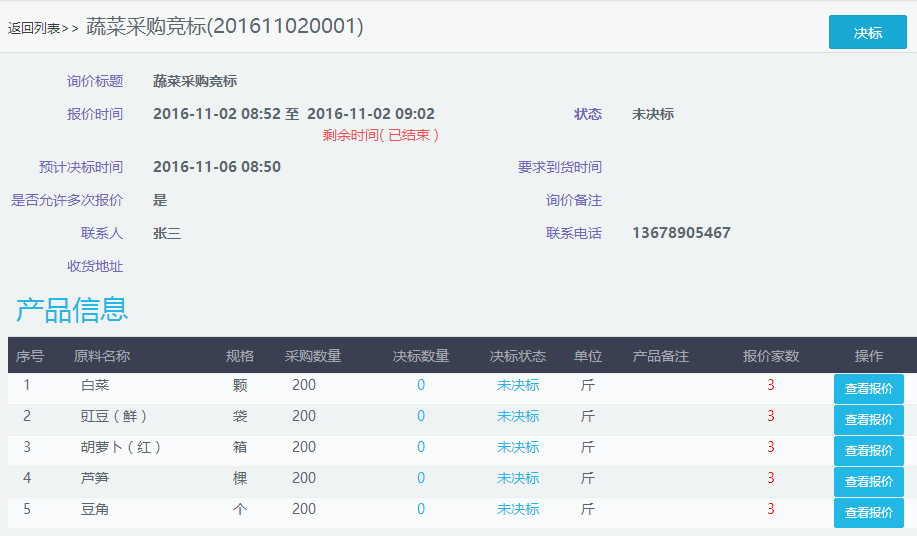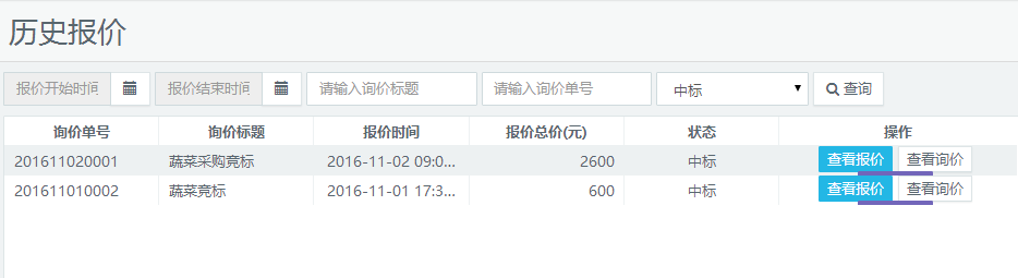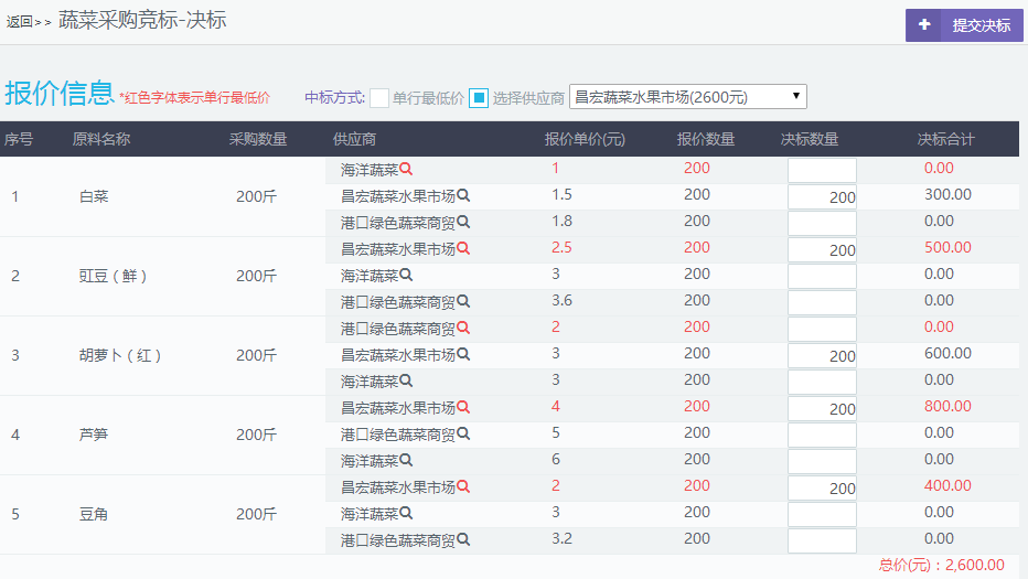 报价时间截止后,食堂查看供应商的报价并进行决标。