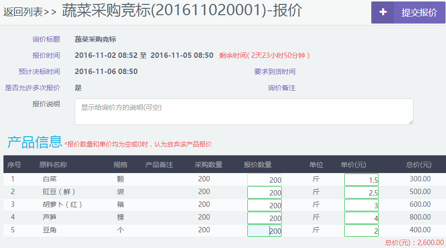 供应商在食堂设定的报价时间范围内进行报价,可以多次报价的询价,以最后一次报价为准。