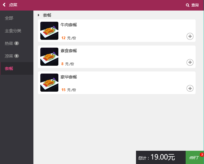 套餐模式需在系统后台先行维护套餐内的菜肴,然后对套餐进行维护,添加好套餐名称,在添加套餐内的菜肴分类,例如热菜、凉菜、主食等分类,在依次在分类里面加上菜品,合理搭配后,然后发布菜谱时直接添加套餐即可。