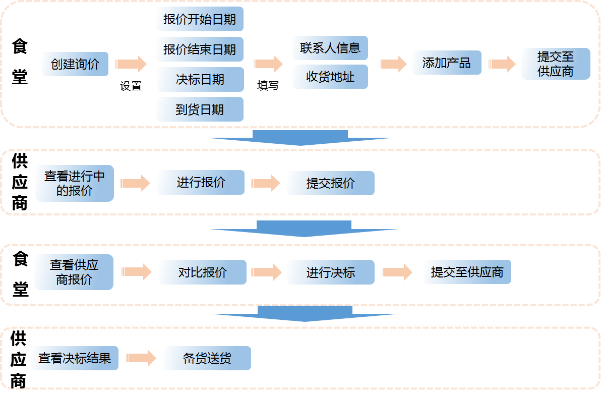 食堂采购管理员直接创建询比价,选择本次询价的原料及数量,可邀请供应商报价。询比价可以设定报价开始、结束时间和询比价决标时间。供应商登录询比价系统,可以查看进行中的询价等相关信息,然后进行报价,以截止日期报价为准。报价时间截止后,食堂查看供应商的报价并进行决标,决标结束后,供应商登录系统查看是否中标。