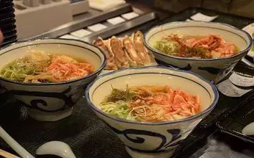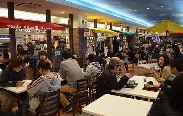 日本高速公路服务区美食城色调清新,利用动线设计,在商品陈列、色彩、灯光等方面精心搭配,给人以轻快明亮的感觉,食品色香味形诱人,消费者一进去就有食欲。餐饮区分隔成若干个特色小档口,以“轻食”为主,饭团寿司、面食和油炸半成品居多,主要是方便和节省停留时间,价钱公道合理。最常见四大菜式:定食(套餐)、牛肉盖饭(大碗牛肉馆)、咖喱饭、荞麦面乌冬、海鲜拉面等等。