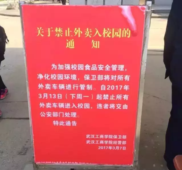 2017年5月,据都市时报报道,记者走访昆明12所高校得知,有10所高校禁止外卖车辆进入校园。2016年7月以来,在高校云集的武汉地区,华中科技大学、华中农业大学、武汉理工大学、武汉体育学院等高校,最近都纷纷划立了“禁区”——限制外卖车辆进入公寓区。