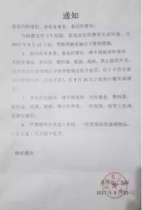 江西南昌理工学院对全校学生、校内所有食堂和食品经营店下发了一则通知,自9月22日起,要求校内所有食堂及食品经营店,一律不得提供和使用一次性餐具、塑料袋等,并严禁外卖进校。