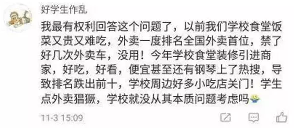 对于学校的外卖禁令,不少同学在网上发表了自己的观点,有人认为选择叫外卖也是迫不得已: