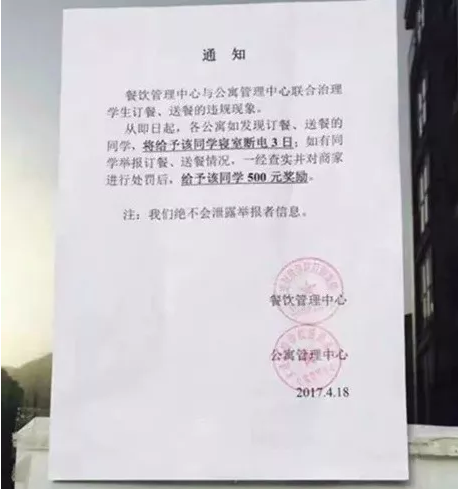 2017年4月18日,一则落款为大连财经学院后勤集团的通知,引起该校学生热议。通知中写到:从即日起,各公寓如发现订餐、送餐的同学,将给予该同学寝室断电3日;如有同学举报订餐、送餐情况,一经查实并对商家进行处罚后,给予该同学500元奖励。