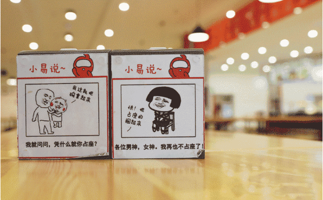 纸巾盒、收餐台、门帘……食堂里随处可见搞笑的表情包,提醒大家不要占座不要插队不要浪费食物。看到正义的蘑菇头,除了忍不住哈哈大笑,还真是不由自主地乖乖听话了。