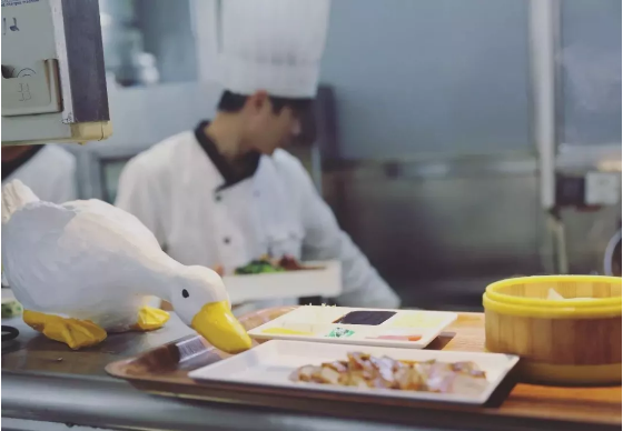 要说名气,七食堂大概是紧随二食堂之后的。一进门对着的地方就是烤鸭档口,柜台上还摆着鸭子公仔,简直可爱。