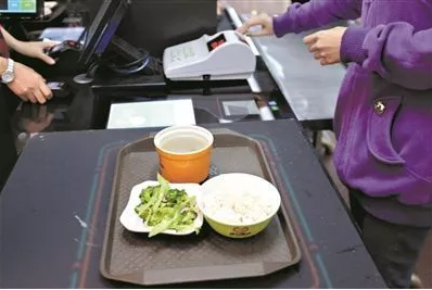 2、选完餐,学生便端托盘来到出口排队结算。