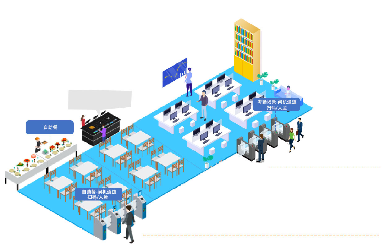 人脸扣费闸机采用红外活体人脸检测技术,凭借高性能、高稳定性、高可靠性,广泛适用于政企单位、高校、中小学、医院等业态,主要用于食堂自助餐消费,工地工厂、小区学校、车站、酒店写字楼、景区进入门禁管理、考勤管理等多场景。