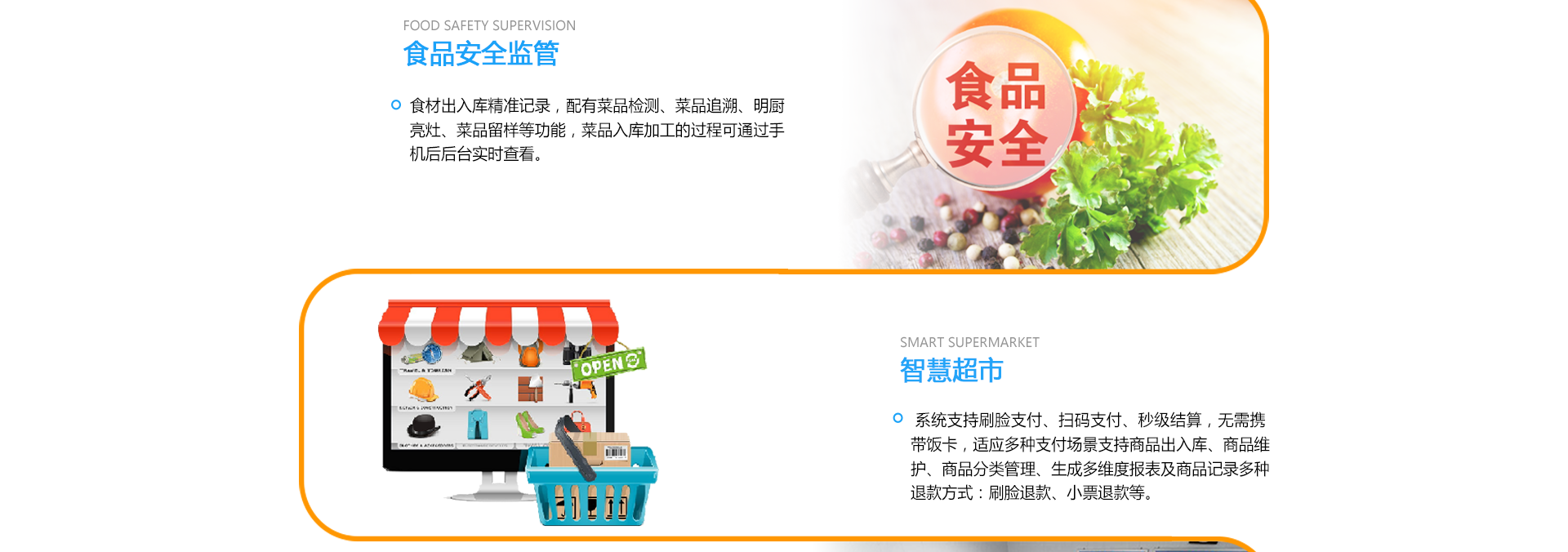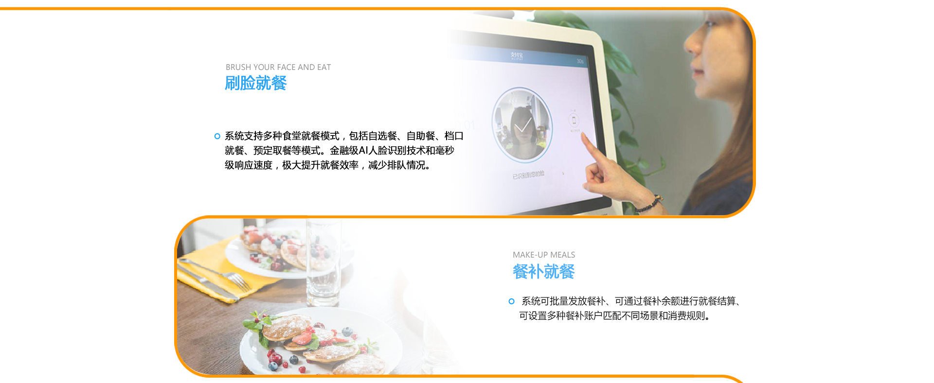 系统支持刷脸支付、扫码支付、秒级结算,无需携带饭卡,适应多种支付场景支持商品出入库、商品维护、商品分类管理、生成多维度报表及商品记录多种退款方式:刷脸退款、小票退款等。