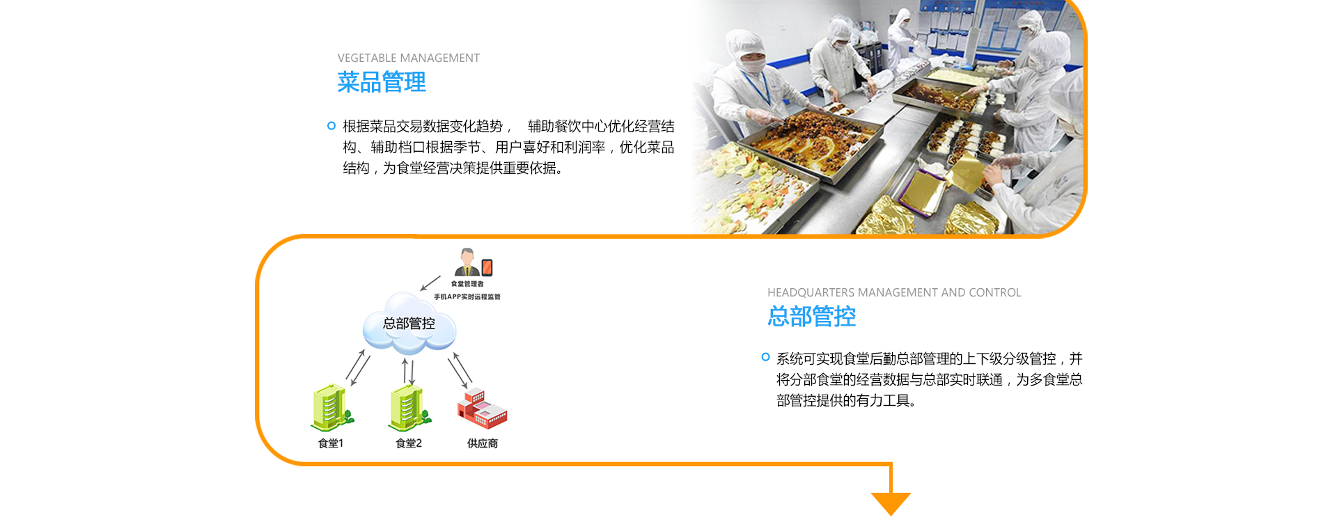 系统可实现食堂后勤总部管理的上下级分级管控,并将分部食堂的经营数据与总部实时联通,为多食堂总部管控提供的有力工具。