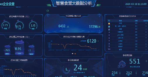 学校管理者或教育局可通过数据分析平台对食堂经营情况、人员就餐情况、人员就餐费用、食堂就餐效率、菜品销售排名、食堂菜谱数量等进行云端监管,并对食堂运营数据进行分析,为决策者提供可视化数据。